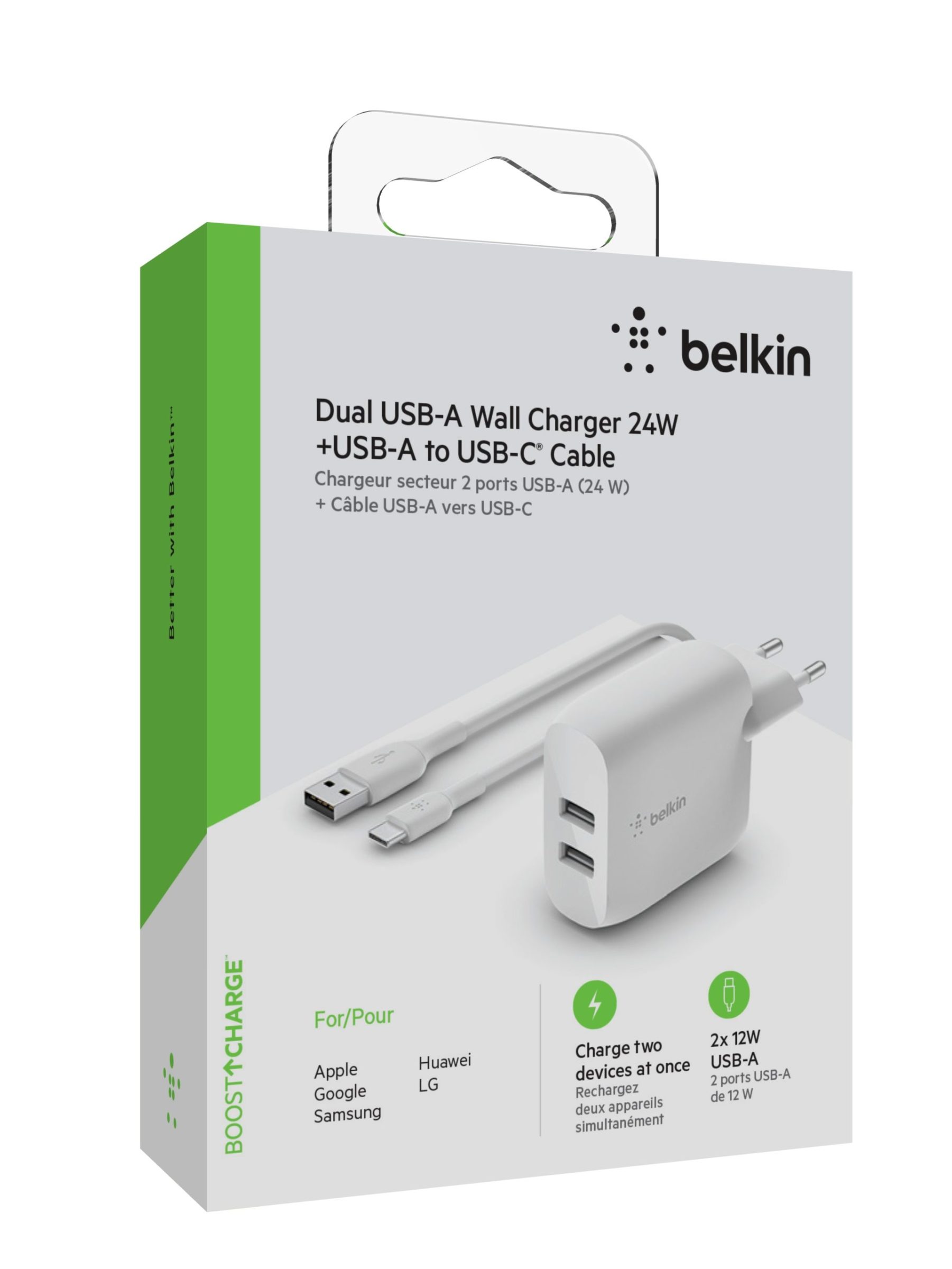 Belkin BOOST CHARGE 24w USB-A Dual Wall Charger w/ 1m A-C – White